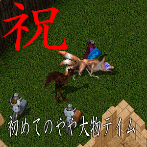 きんときが果敢に突っ込んで、お友達がクーシーちゃんで周りのモンスをやっつけ、その隙にまめはそうっとバケ狐に近づいて……ああ……なかなか懐いてくれないわ!